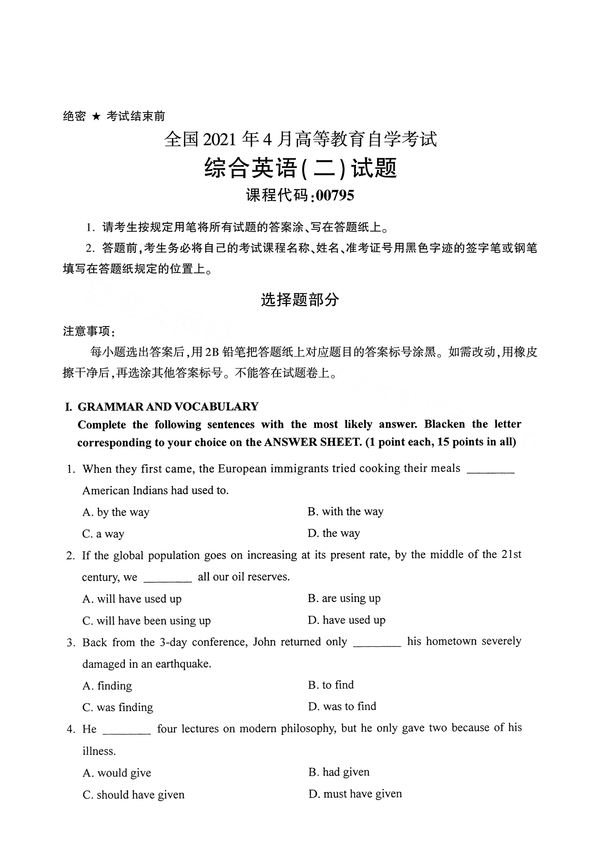 以下是2021年4月云南自考00795综合英语(二)试题真题试卷内容
