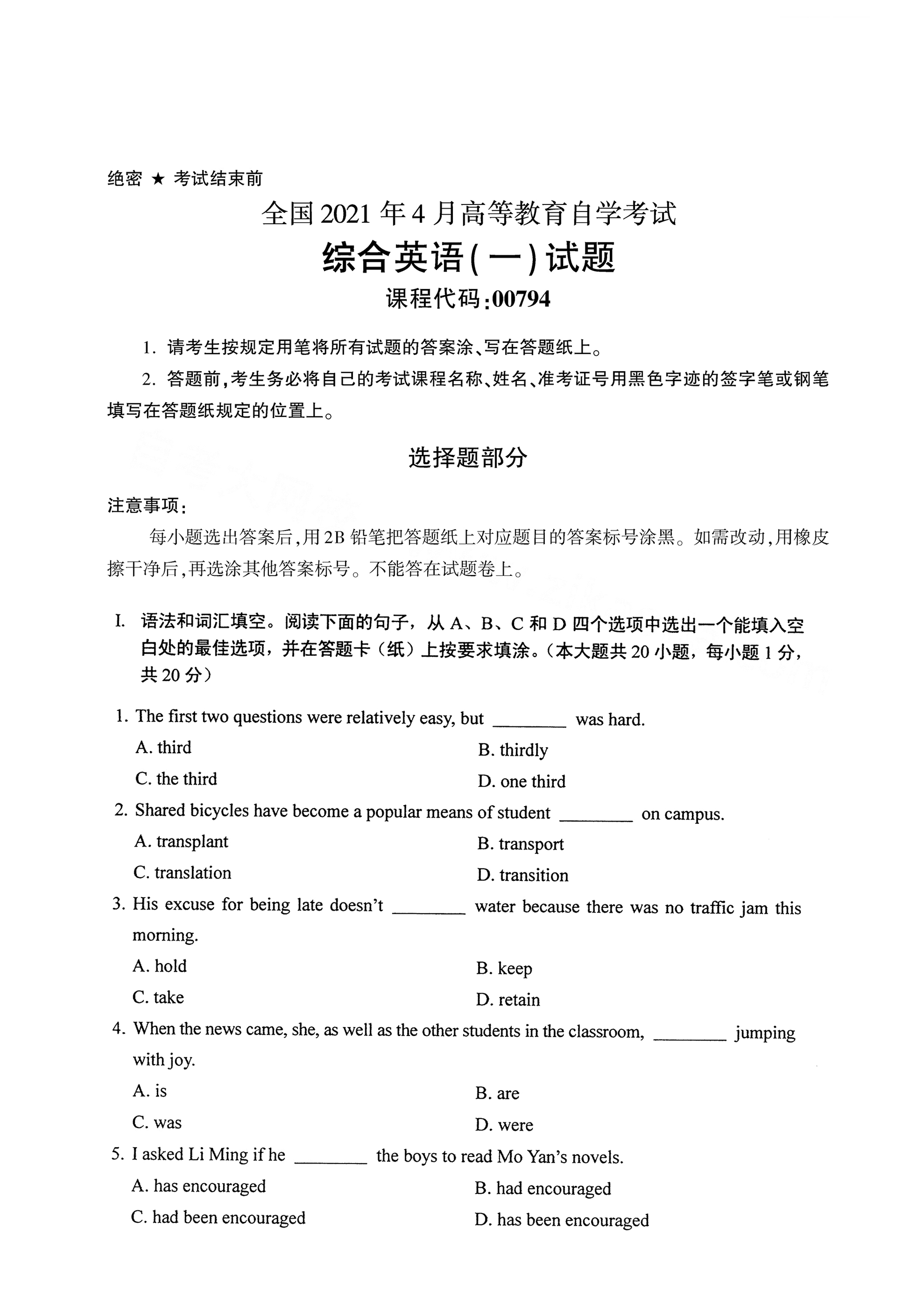 以下是2021年4月云南自考00794综合英语(一)试题真题试卷内容