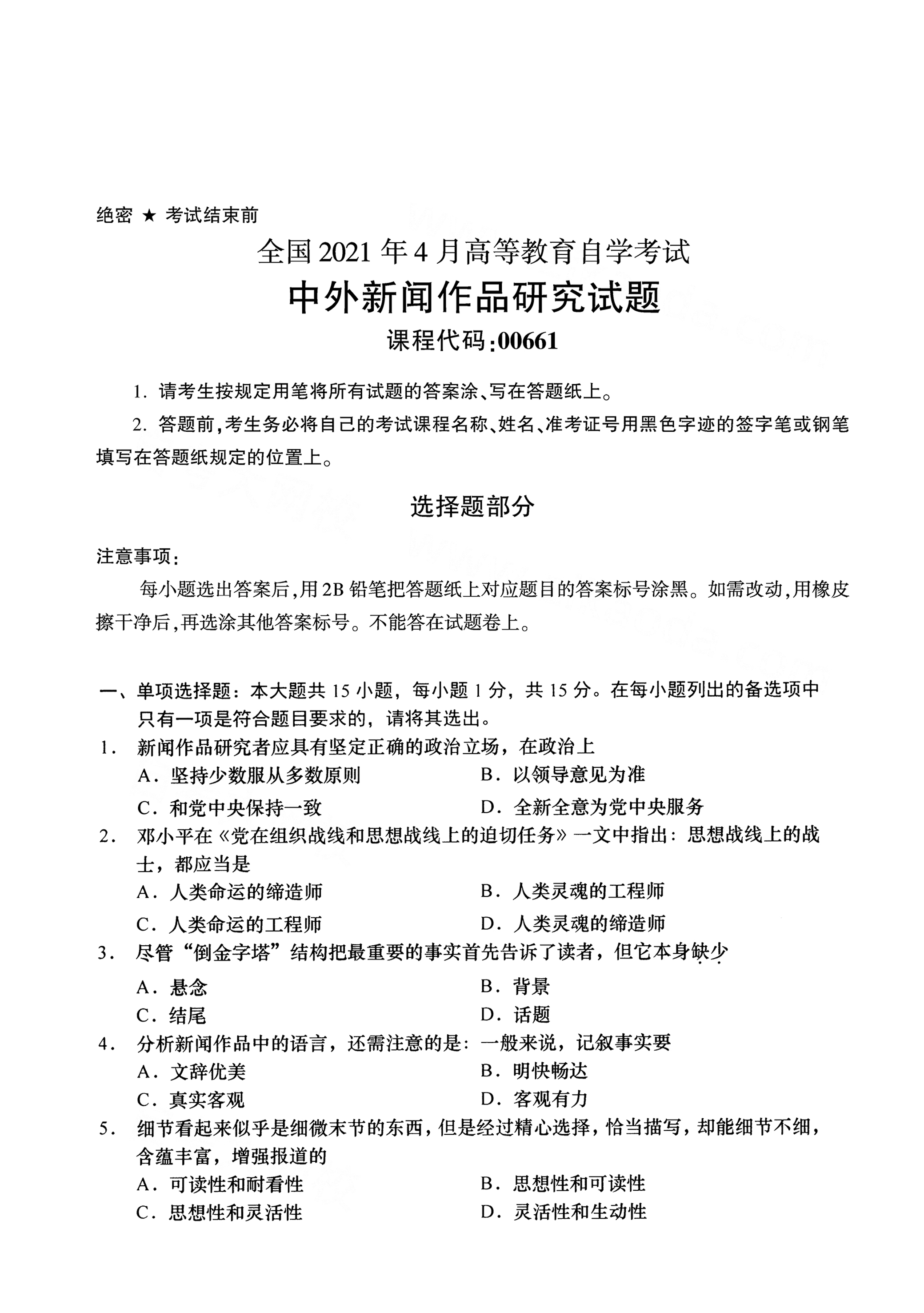 以下是2021年4月云南自考00661中外新闻作品研究试题真题试卷内容