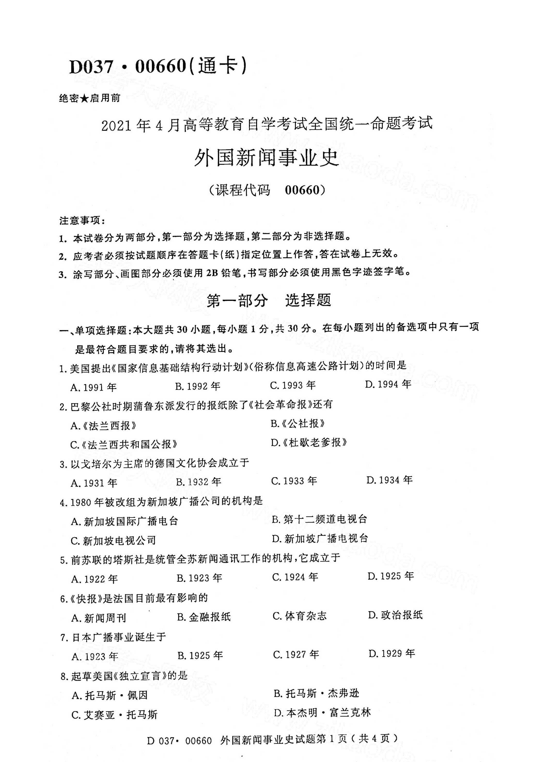 以下是2021年4月云南自考00660外国新闻事业史真题试卷内容